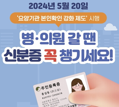 매번 진료 보는 병원이라고 할지라도 5월 20일부터는 본인 확인 및 건강보험 자격 확인을 위한 신분증 제시가 필요합니다. 신분증을 챙겨가시거나 편하게 스마트폰으로 모바일 건강보험증을 이용하세요.