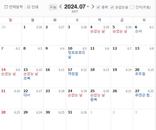 7월 이사하기 좋은 날짜는 총 6일입니다. 초복, 중복이 있는 7월에는 1,3,4주에 손없는 날이 존재합니다. 자세한 날짜는 아래 표를 통해 확인해 보실 수 있습니다.