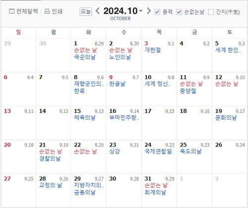 2024년 이사가기 좋은 10월에는 월초부터 손없는 날이 즐비합니다. 다른 월에 비해 하루 정도 손없는 날짜가 더 많습니다. 아래 표를 보고 10월 이사하기 좋은 날짜를 확인해 보실 수 있습니다.