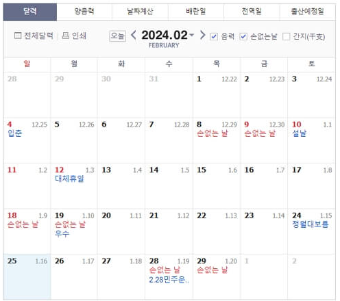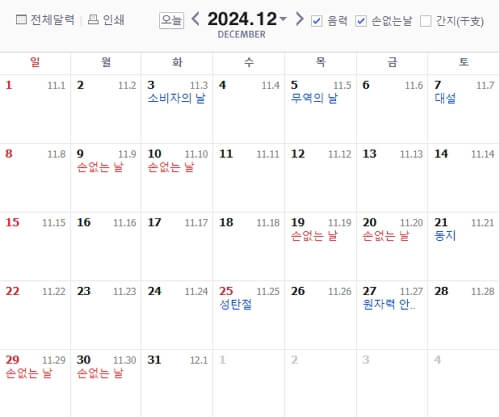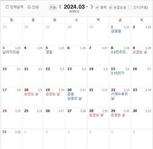 2024년 월별 이사하기 좋은 날 (손 없는 날) 바로가기