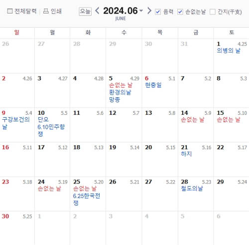 | 6월 | 6/5, 6/14, 6/15, 6/24, 6/25 (5일) |